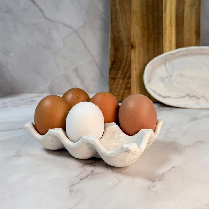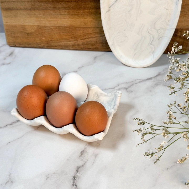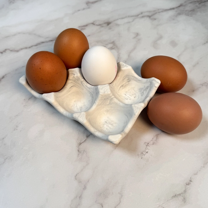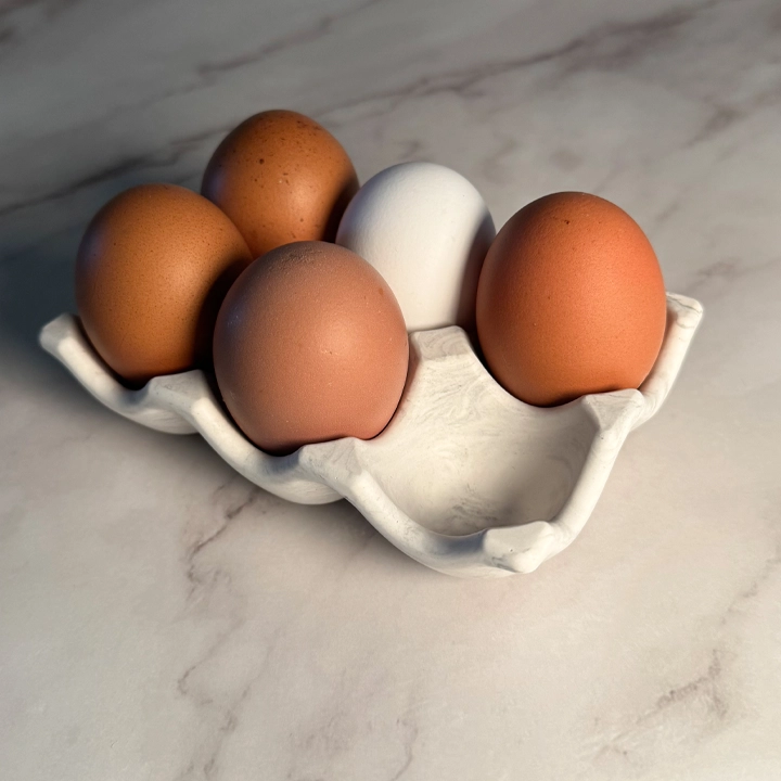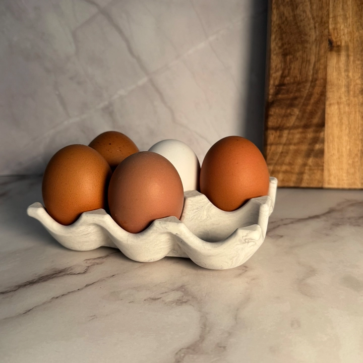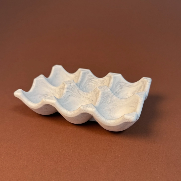 Nils eggeholder er håndlaget i Jesmonite og har plass til 6 egg. Den runde og vennlige formen gjør den perfekt på bordet, enten til frokost eller festlige anledninger.